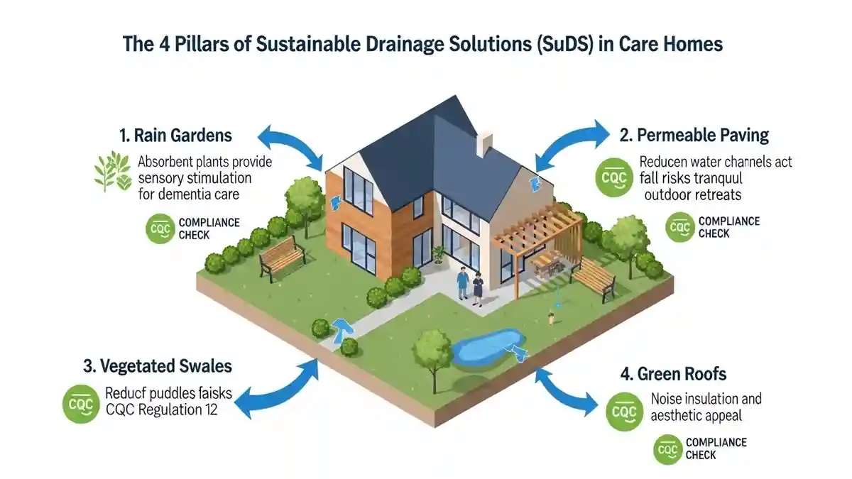 The future of sustainable drainage solutions CQC care home design is the integration of SuDS (Sustainable Drainage Systems). In Hampstead, Policy EN18 of the Local Plan encourages SuDS to manage surface water runoff, which often plagues the surrounding area.